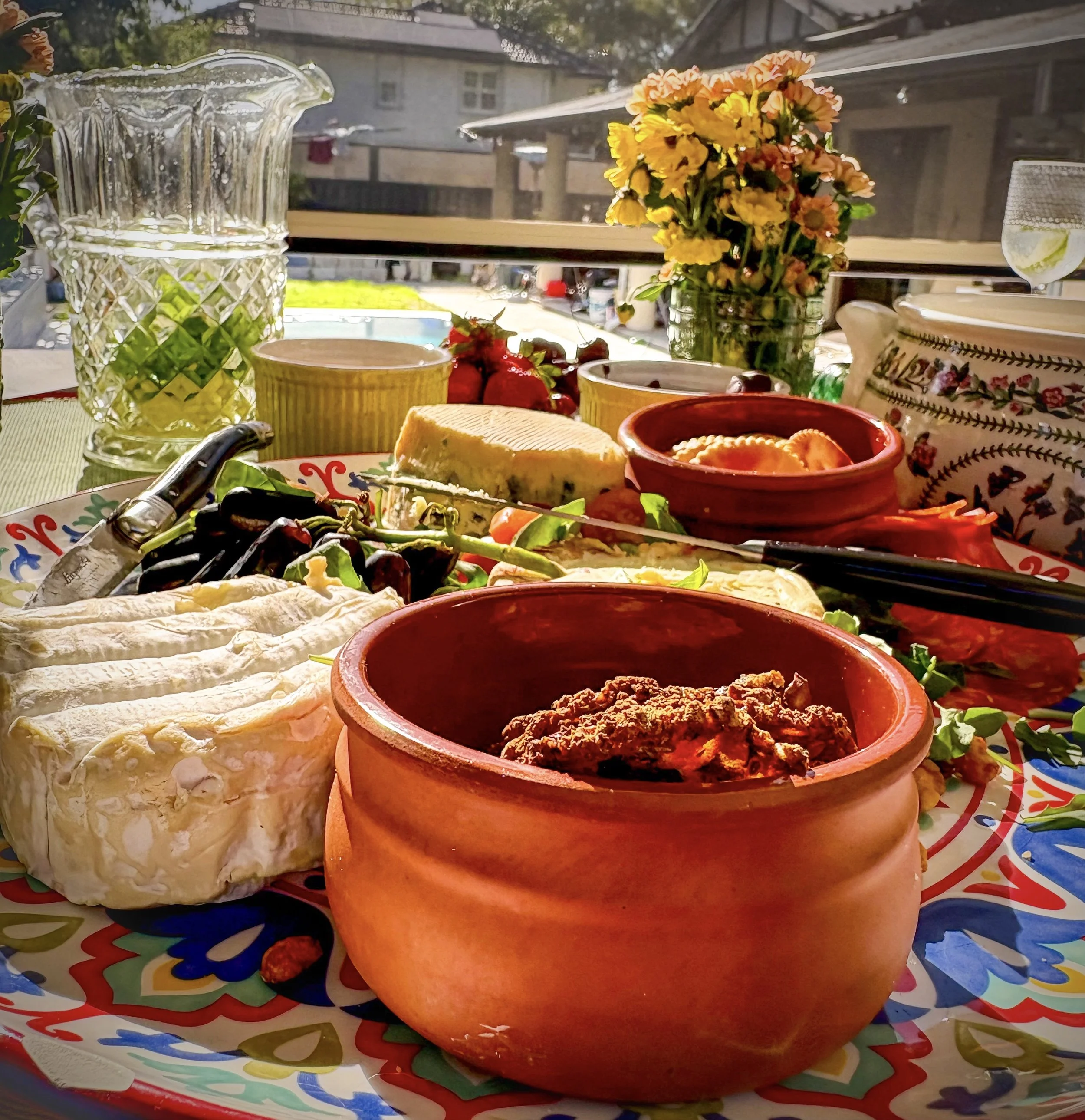 I paired with a spring green runner, and some gorgeous green glasses that I found at KMart for an absolute song. Yellow ramekins and terracotta serving dishes further pinned down the sunset vibes and the table looked vibrant and fresh against the blue sky and the grey tones of our deck.