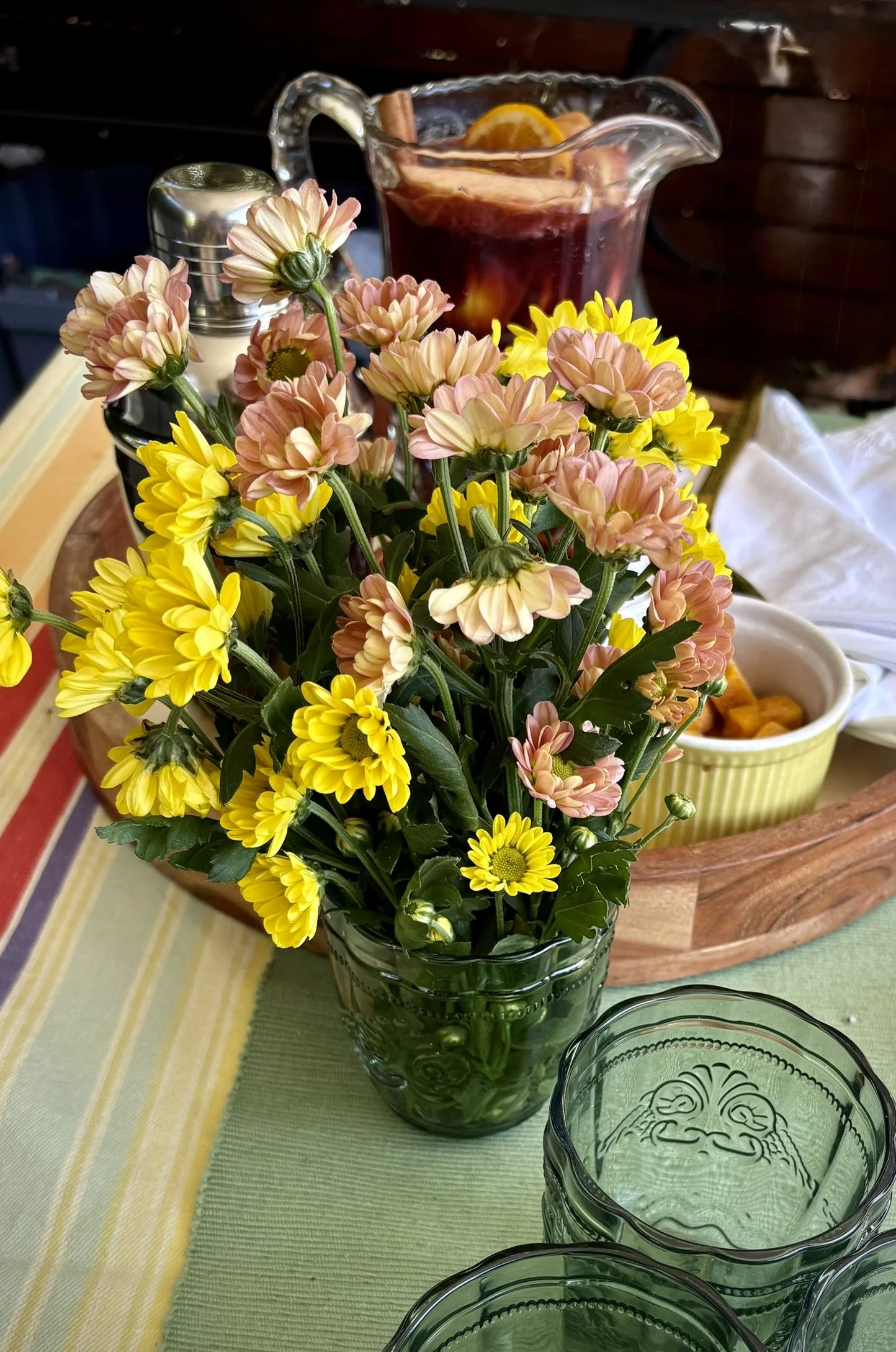 I found a cheery striped table cloth for under $10 at a local thrift store. Its warm yellows and peaches, dusky red and violet brought both sunset and fruity cocktails to mind when I saw it on its hanger at the store, and I knew it was destined for this occasion.