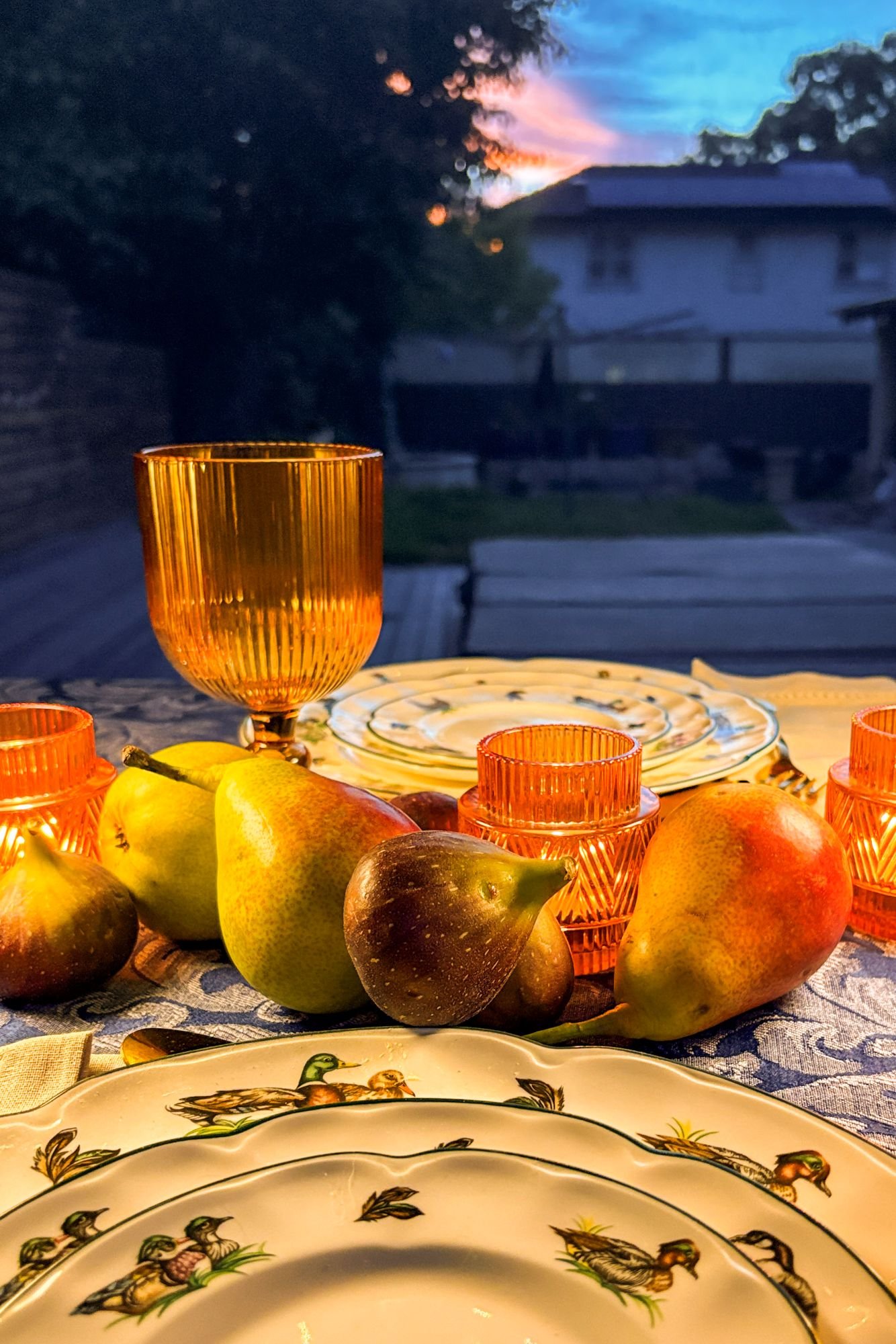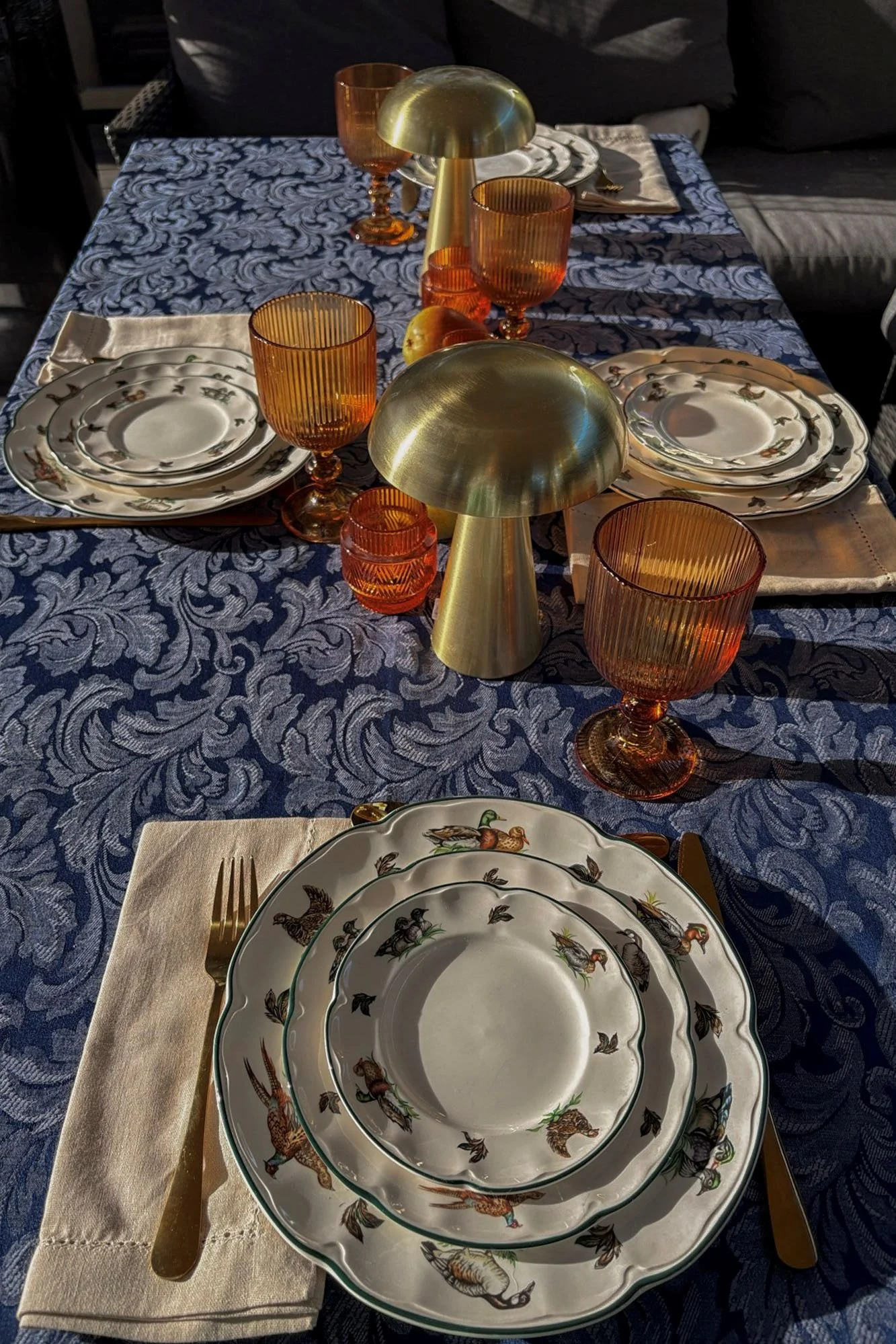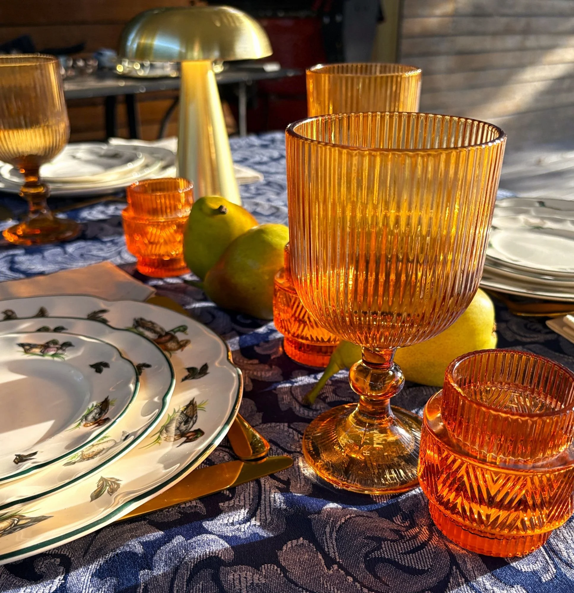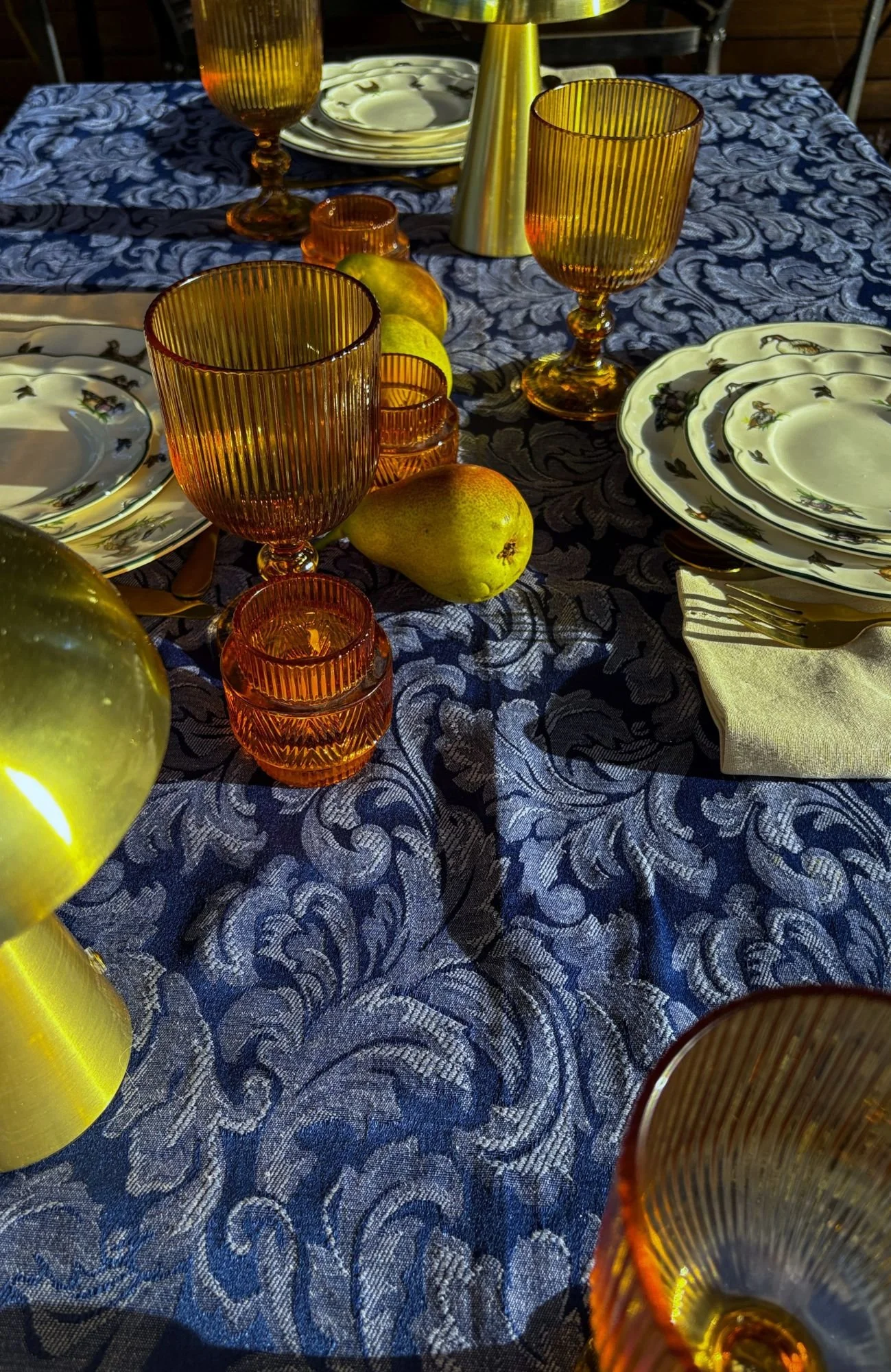 The equinox felt worth marking. That particular turning point in the year when the long, hot, languid days of summer finally begin to loosen their grip, and the evenings start arriving earlier and staying longer. I wanted the table to celebrate both the golden glow of a summer day, and the deep blue of the coming night. Navy, amber, and ivory. The palette almost chose itself.